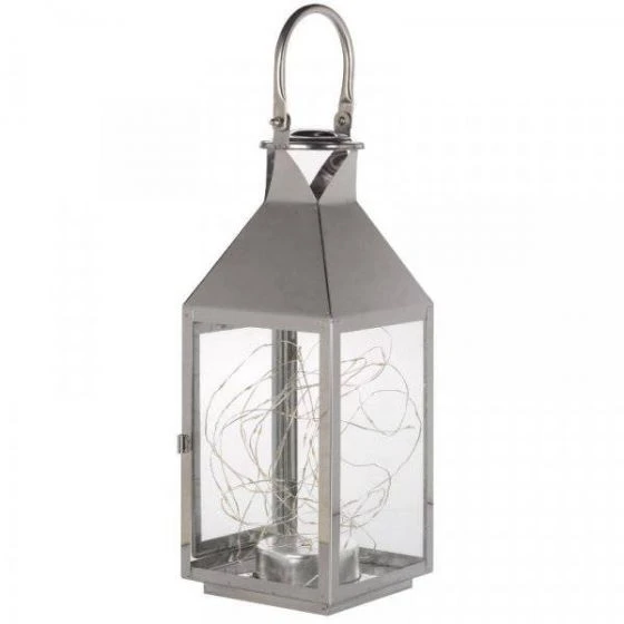 - Contemporary Stainless Steel Lantern filled with 50 warm white firefly string lights