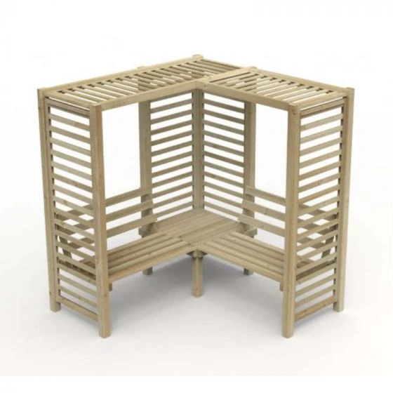 This contemporary slatted Firenze Corner Arbour from Forest combines slats and benches to create a stunning garden structure. The right angled corner design allows two benches on the arbour, compared to traditional arbours.
