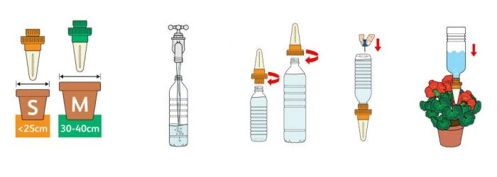 - 4 medium sized watering cones suitable for pots bewteen 30-40cm (12-16″). Compatible with 0.5-2L bottles.