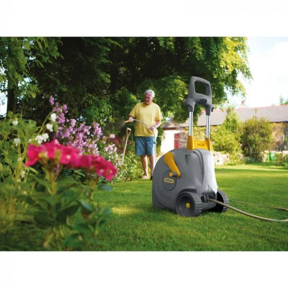 - Extendable towing handle and large wheels allows the hose reel to be fully portable